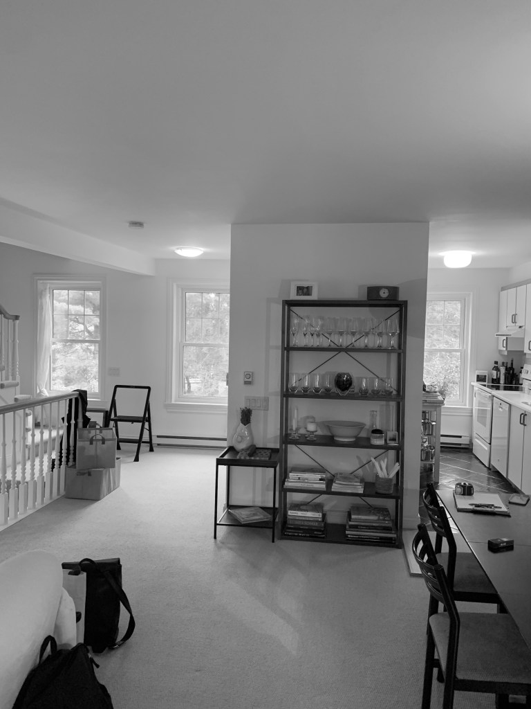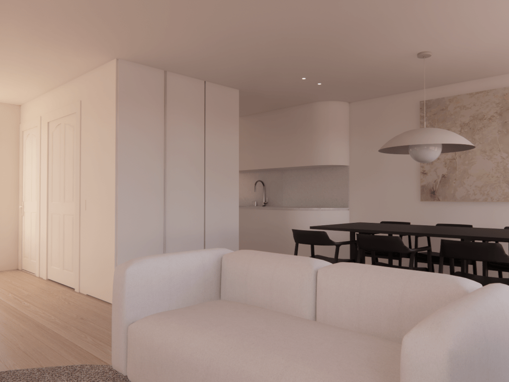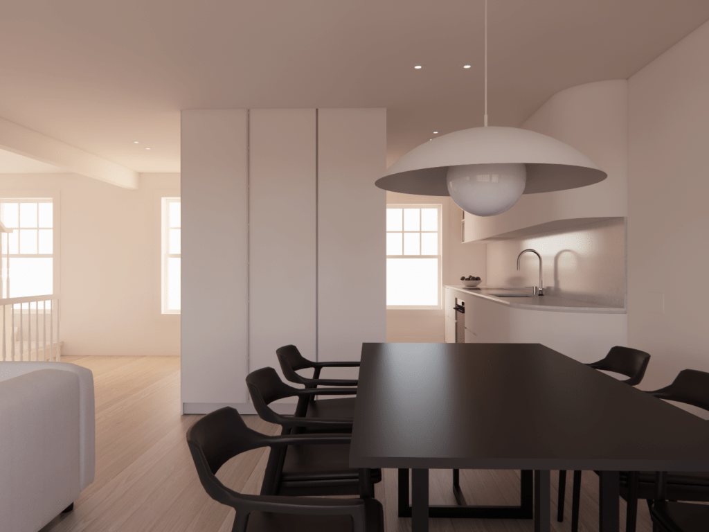 Pour palier au manque d’espace de rangement, la cuisine de M s’invite dans la salle à manger. Les armoires de cuisines se fondent avec les murs pour garder un aspect minimaliste, épuré et intemporel. Le plancher est revêtu de chêne blanc sur tout l’étage pour donner un effet de grandeur.